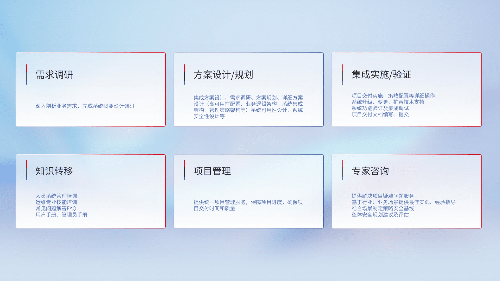 针对客户行业特性,,,,将宏观的安全战略和需求,,,通过专业的交付服务,,,,实现项目落地,,为客户提供标准规范的集成交付服务。。。